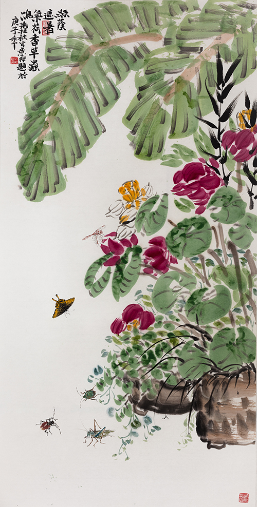 绿荫遮暑气,荷香草虫鸣(138厘米x68厘米)。荆桂秋2020年创作