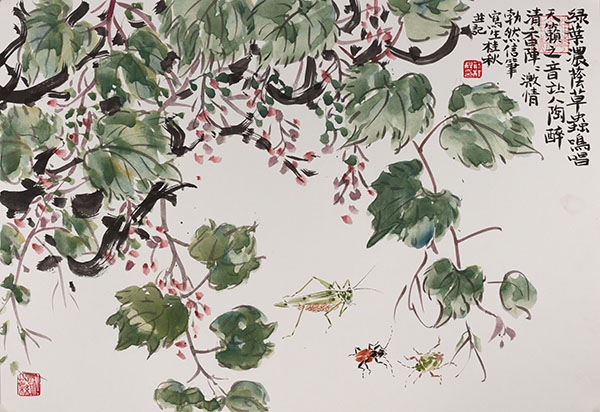 画家作品显见大气浑厚,他用劲健朴厚、爽利从容的笔墨状物写意,抒发情性。无论花草还是动物,他都胸有成竹,落笔大胆肯定,让人想起古人的论述“若忖短长于隘度,算妍媸于陋目,凝觚舔墨,依违良久,乃绘物之赘疣也,宁置于齿牙间哉!”([唐]符载《观张员外画松石序》)。一些作品尺幅虽说较大,却大体恰到好处。画作大气中有节制,灵动里有法度,体现出一种无过无不及“淡而不厌”的“中庸”意味。中庸自然属于中国文化,特别是儒家文化的传统。同时荆桂秋作画喜好用色。一般说来写意画用色很难,搞不好会轻飘鄙俗,全盘皆输,不少画家创作少用乃至不用色多少与此有关。荆桂秋选择了知难而进、险中取胜的色彩美学。其画用色虽多,色不掩墨,艳而不俗,丽而不浮,绘画元素繁而不乱。其底蕴一是学养,二是笔墨。画家色中见笔,墨色相得益彰,依然保持其书卷气。