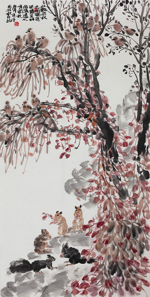 红艳染秋光,绚烂随风扬(138cmx68cm)。荆桂秋2020年创作 荆桂秋深知传统滋养的至关重要,离开传统那创作便会成为无本之木、无基之屋。他曾就读的中国美术学院一贯注重艺术和文化传统的坚守和继承,西子湖畔这座艺术殿堂的文化氛围熏染了负笈南来的北方游子。善于思索的画家在这里矻矻终日,用前人的智慧和笔墨积淀充实自己,又力求不为传统所囿。他的画保持了文人画的精华,重视诗书画的统一和谐,而这画,连同书、款,是有感而发,出自心田的。他说自己要“努力向文人画高雅境界攀登”。