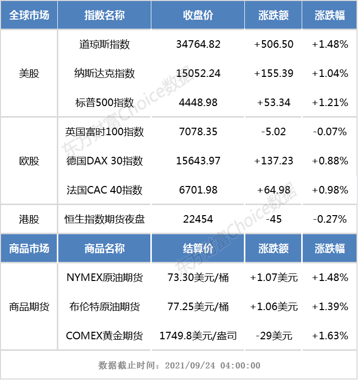 美东时间周四,美国三大指数集体上涨,美联储上一交易日表态不会立即撤回刺激政策措施,令股市得到支撑。截止收盘,道指涨506.50点,涨幅1.48%,报34764.82点;纳指涨155.39点,涨幅1.04%,报15052.24点;标普500指数涨53.34点,涨幅1.21%,报4448.98点。