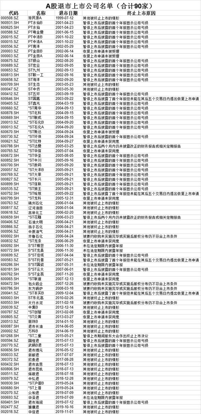 尺度整理了一份数据,自1990年中国股市开业以来,2019年是退市最为凶猛的一年,一共有19家上市公司退出证券交易。