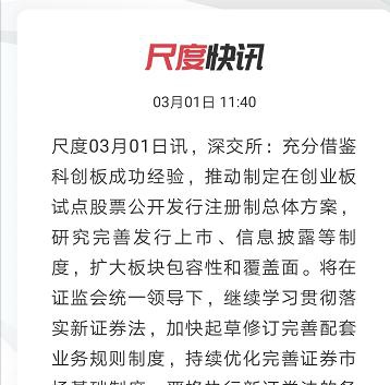 据尺度快讯,今日上午,深交所对外表示,“充分借鉴科创板成功经验,推动制定在创业板试点股票公开发行注册制总体方案,研究完善发行上市、信息披露等制度,扩大板块包容性和覆盖面。”