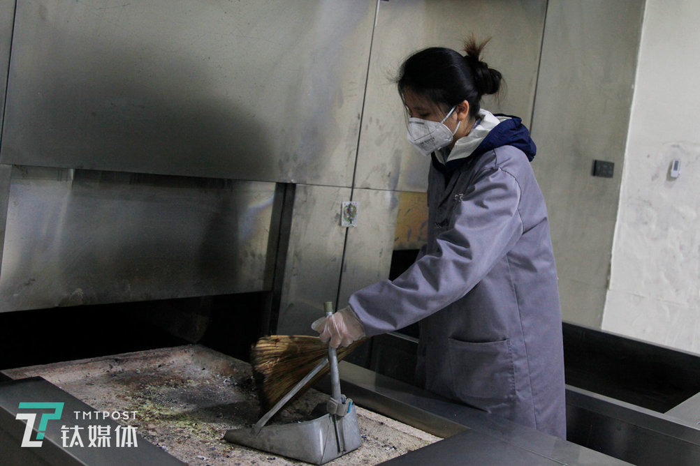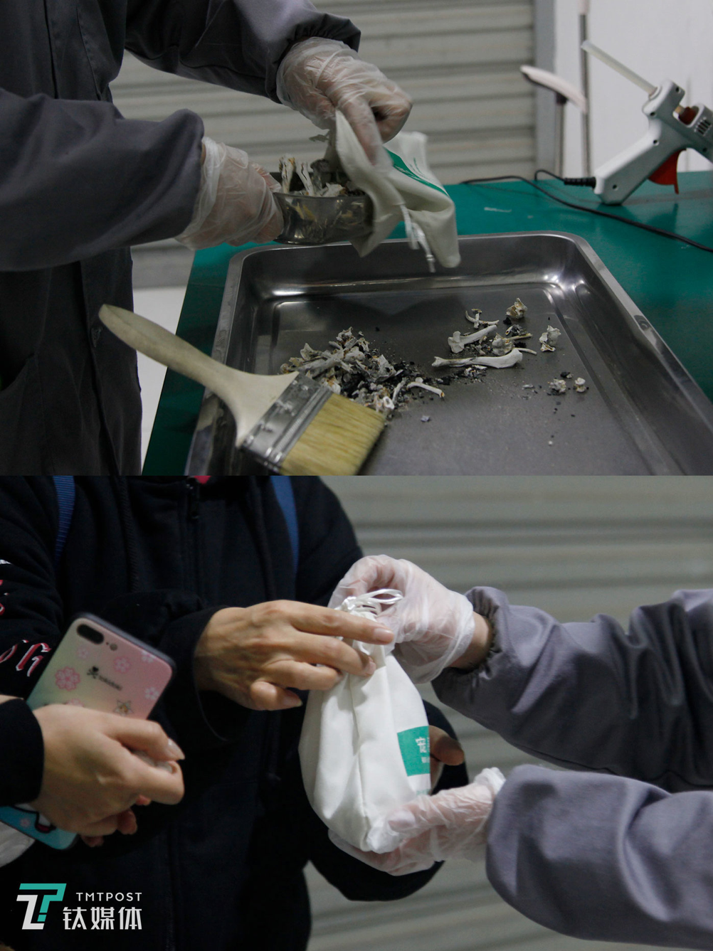 Once a cremation is complete, Mo Mo cleans up the pet's remains and hands them over to its owner.