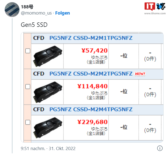 近日,这款 SSD 在日本的售价曝光,根据爆料者 @momomo_us 发现的信息,该 SSD 的售价为: