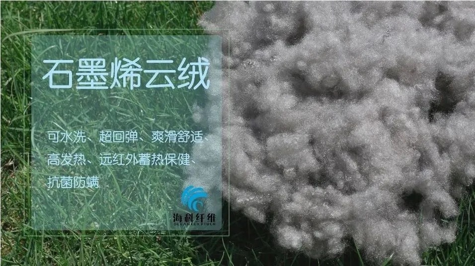 石墨烯纤维拥有许多突出的特点,如低密度、高强度、高柔性、优异的导电性和导热性,且具有极高的结构设计性和性能可调控性。目前,石墨烯纤维在电学和热学性能上已经超过了传统的碳纤维和碳纳米管纤维,在轻质导线、功能织物、功能性填充纤维、传感器件、能源、催化等领域展示出了广泛的应用潜力。石墨烯云绒以聚对苯二甲酸乙二醇酯 (PET) 为基本原料,通过石墨烯熔融共混纺丝工艺制成,是具有海科云绒的优良性能及石墨烯功能性于一体的纤维,除具有可水洗、超回弹、爽滑舒适等性能,更加突出了抗菌、高发热、远红外蓄热保健、驱螨等功能,是羽绒的绝佳代替品。石墨烯的二维结构使其能够与细菌细胞膜发生强相互作用,破坏细菌的细胞结构,这是其具有高效抗菌性能的原因。检测数据显示,石墨烯云绒对金黄葡萄球菌、大肠杆菌以及白念珠菌的抗菌率的抑菌率均达到99%。另一款创新产品——海科石墨烯量子点云绒,则通过海科云绒的纺丝工艺与石墨烯量子点母粒共混纺丝工艺制成。石墨烯量子点是对石墨烯微片功能化制备而来的,具有更小的尺寸和更强大的功能,为家纺蓄热和户外保暖领域的产品升级开发提供了更大的可能性。