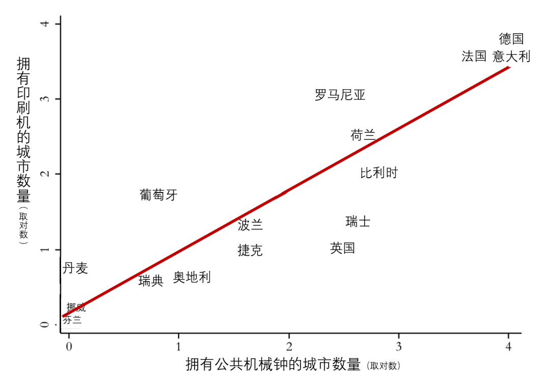 公共机械钟最早出现在13世纪晚期的意大利北部,英国南部和德国南部的城镇地区。之后在14世纪传遍西欧地区,直到15世纪才抵达东欧和斯堪的纳维亚。制造和维修公共机械钟的钟表匠大部分来自专业的铁匠、金匠和锁匠。他们掌握着当时中世纪最先进的金属加工、精细机械等手工技艺和实践经验,能够绘制、设计和制造包括机械钟在内的各类机器,并逐步形成行会制度。这些高度专业化的技能也令原本是铁匠兼金匠的德国人古腾堡在1450年发明出活字印刷机。因此,有机械钟的城市形成的技术集聚将在当地产生技术溢出效应,即会更早使用印刷术等新技术(见图1)。
