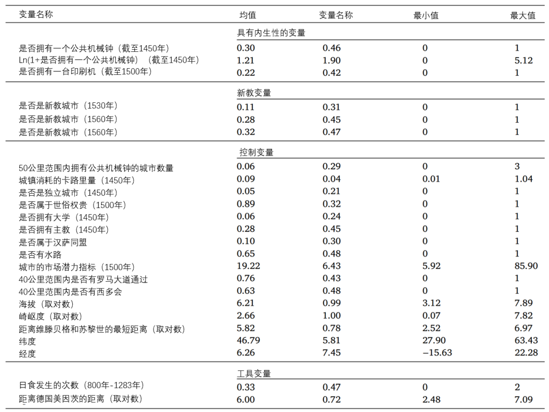 本文使用的764个欧洲城市拥有公共机械钟数量的统计数据来自Boerner and Severgnini (2019),印刷机数量以及宗教改革相关数据来自Rubin(2014),其他城市级别的控制变量均取自Rubin(2014)等(见表1)。本文还考虑到存在无法观测的因素,例如,城市原有的识字率水平、提供公共物品的意愿,会影响机械钟和印刷机在城市的分布数量,因而采用工具变量替代具有内生性的变量。