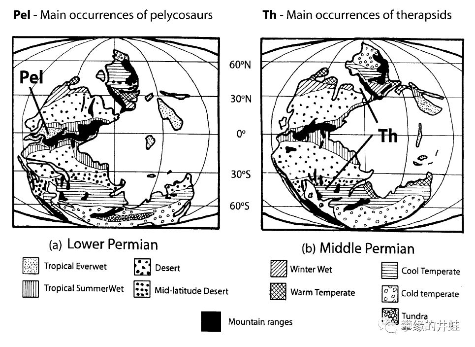 盘龙目(A图,Pel)和兽孔目(B图,Th)主要化石发现地区的二叠纪古气候对比。可以看到盘龙目主要分布在温暖湿润的热带雨林和湿地;而兽孔目已经扩散到原理赤道,寒冷干燥的内陆地区。图片来源自[2]。