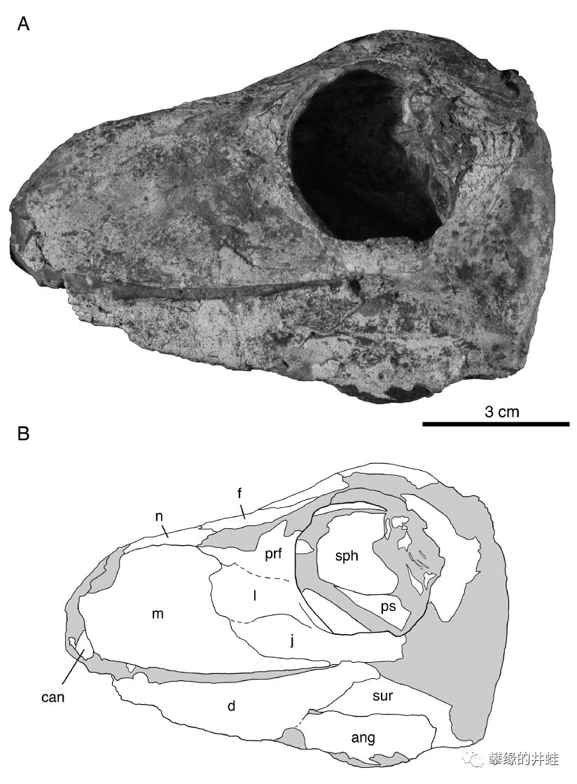 卡鲁盆地发现的巴莫鳄类Lobalopex mordax化石。图片来源自[11],标尺长度1厘米。