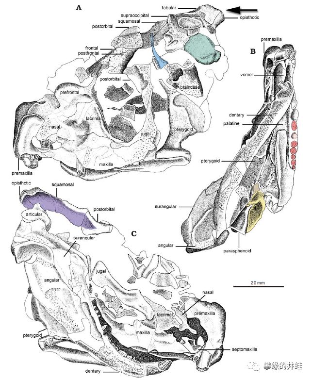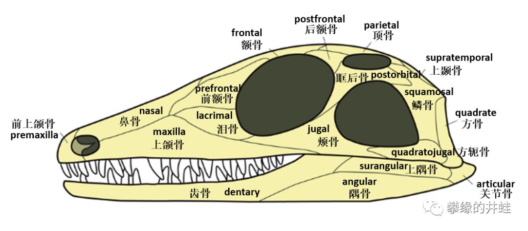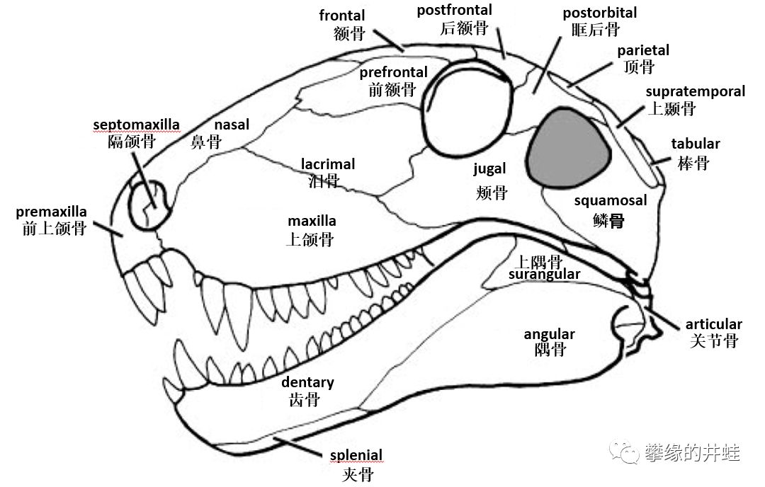 注意图中的下颌,齿骨,隅骨,上隅骨的分界非常明显。这种“拼接式”的下颌骨,还有形状功能基本一样的同型齿(Homodont),是蜥形纲头骨的主要特征。图片来源自网络。