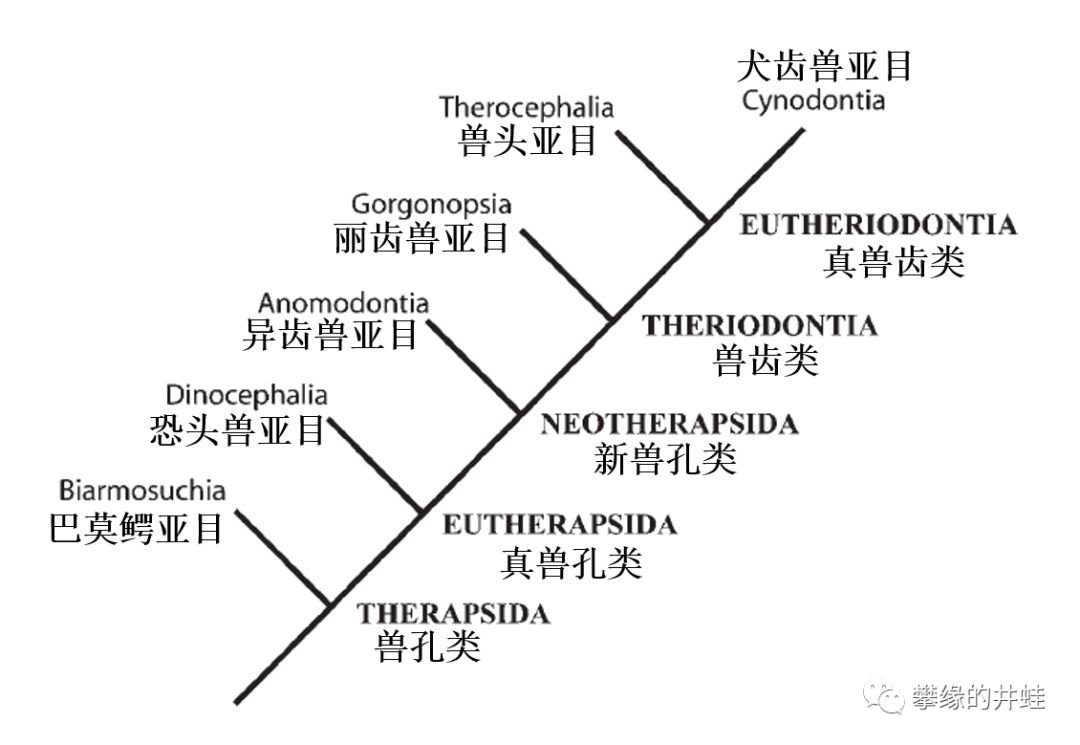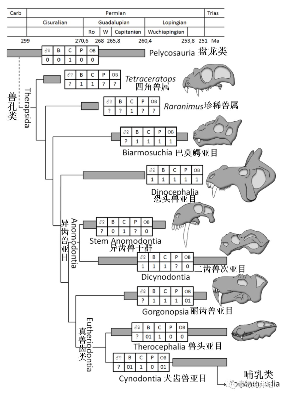 兽孔目主要类群和生存时代。四角兽和珍稀兽大致处在最基干的演化位置。大体上,越靠下的类群,演化程度越高。犬齿兽亚目包含一个演化支:哺乳形类Mammaliaformes,包括哺乳动物和最接近哺乳动物的类群。从图上也可以看出,发达的犬齿是大多数兽孔类的标配。图片来源自[6]。