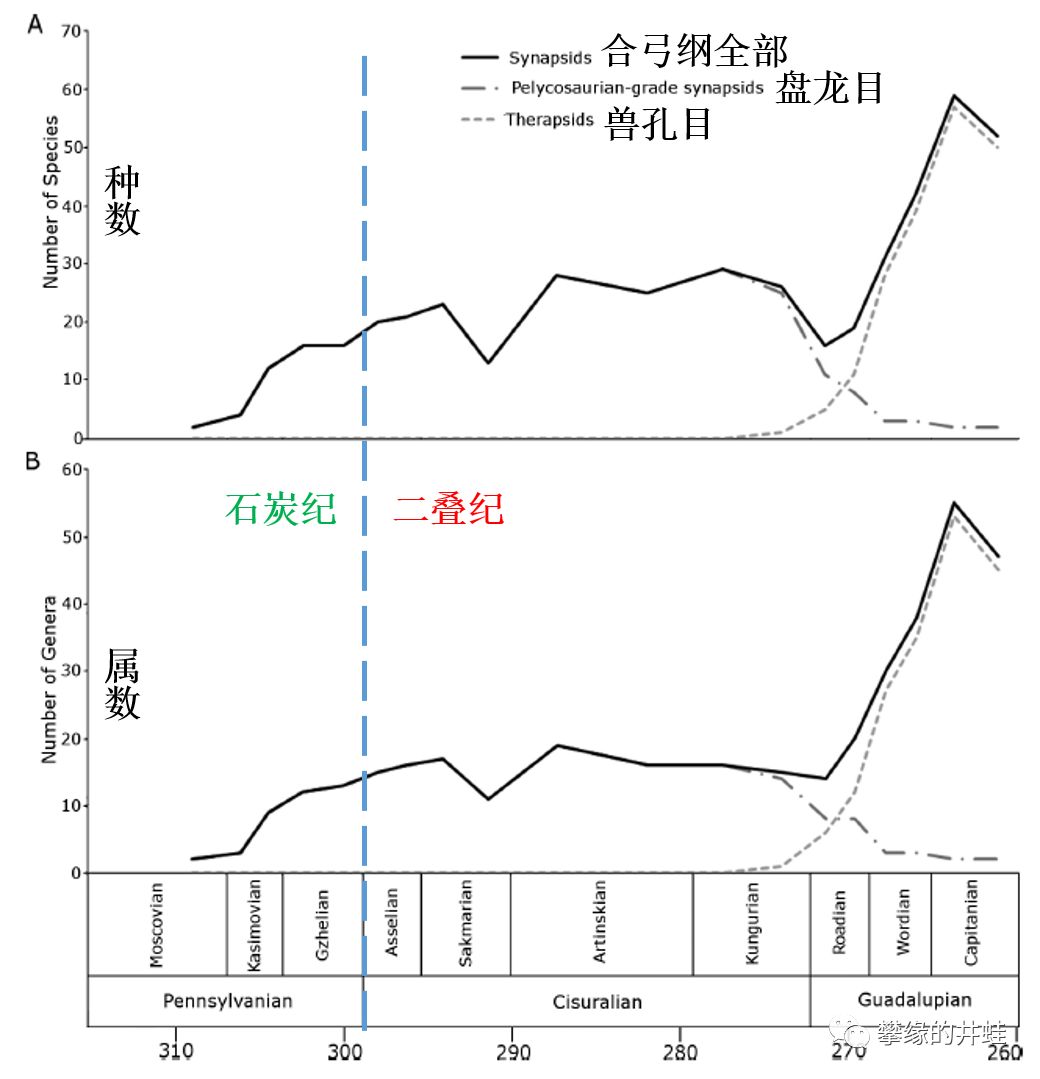 盘龙目和兽孔目多样性变化对比。可以看到大约在2.75亿年前,盘龙目跌落的同时,兽孔目迅速崛起,把合弓纲的多样性推上了一个高峰。图片来源自[1]。