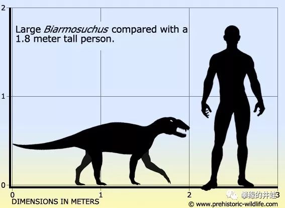 成体Biarmosuchus tener全长估计在2.5米左右,曾经被命名为另一种动物:始巨鳄(Eotitanosuchus olsoni)。听名字很容易让人想起电影里的食人怪物,但实际上并没有那么恐怖。