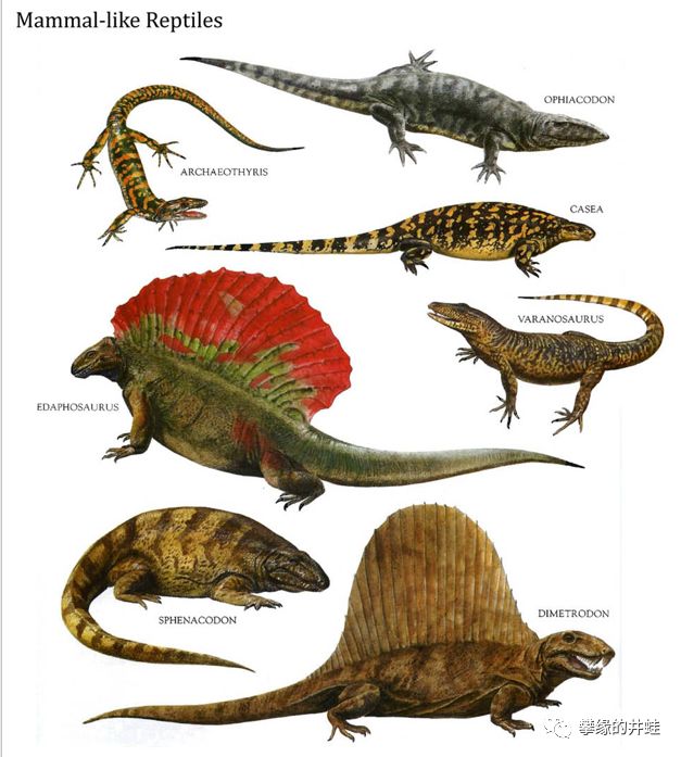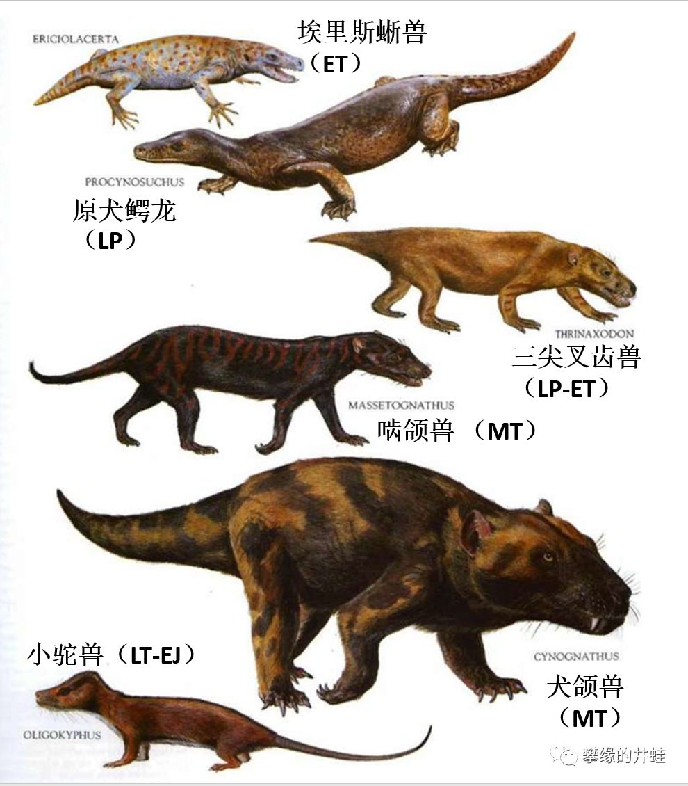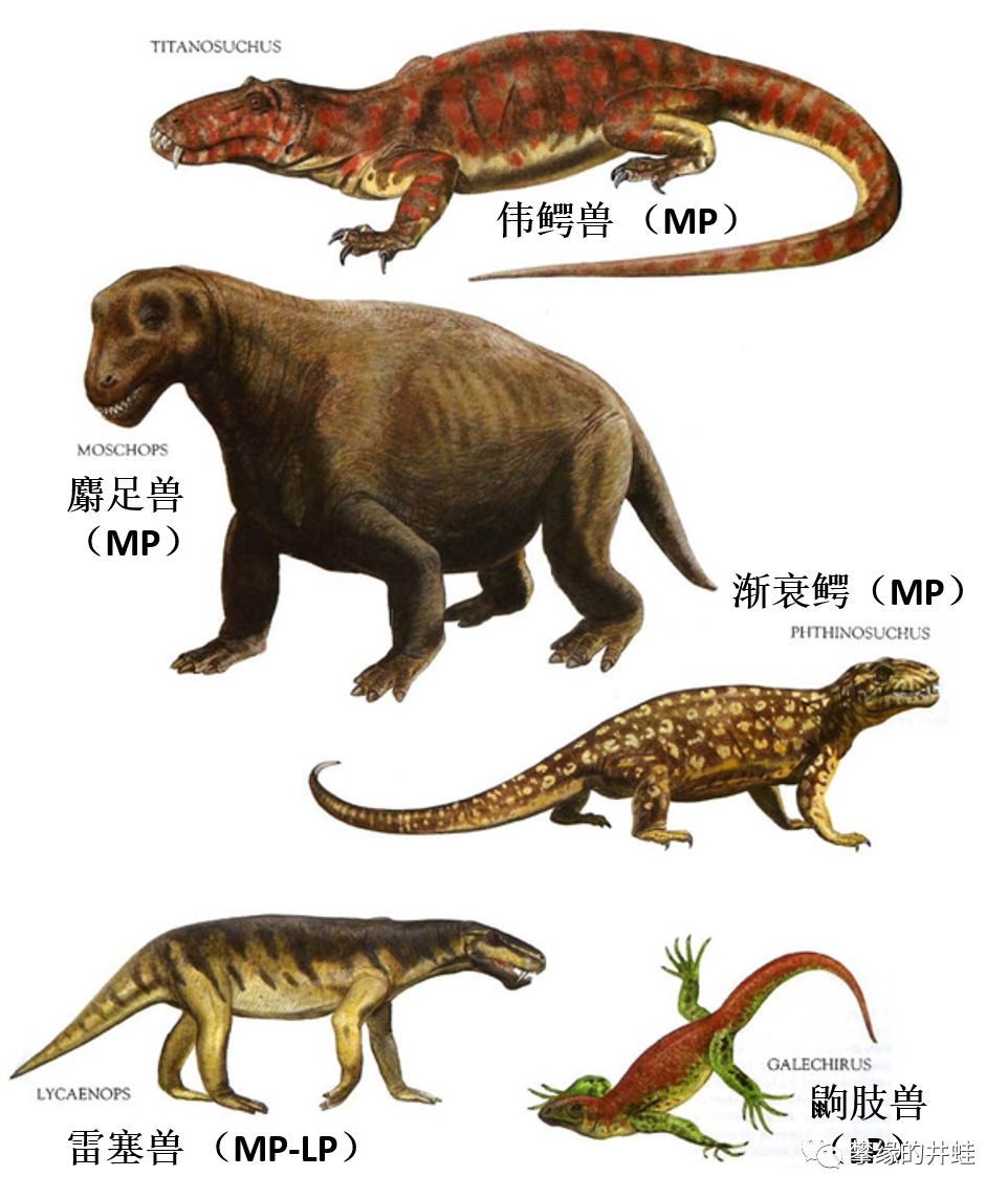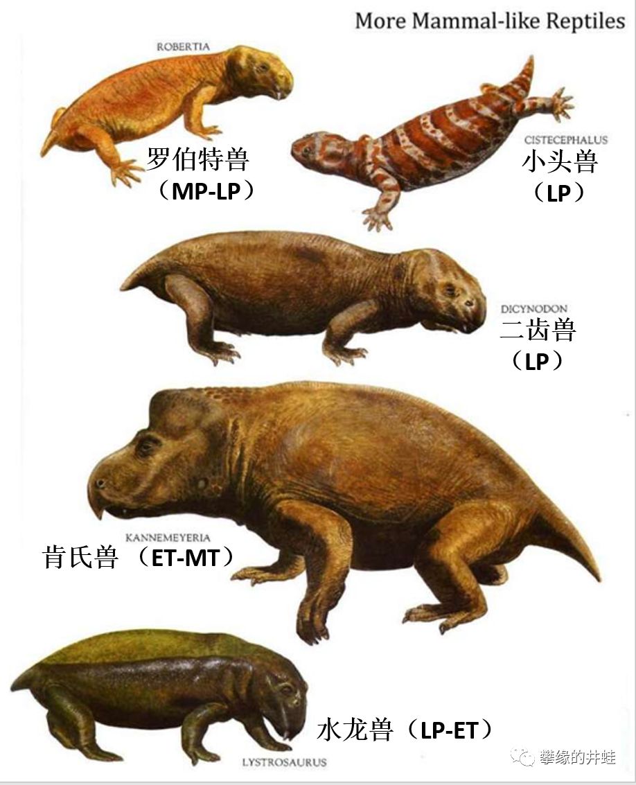 一些兽孔目动物的复原图,井蛙加上了译名和生存年代(MP:中二叠世;LP:晚二叠世;ET:早三叠世;MT:中三叠世;LT:晚三叠世;EJ:早侏罗世)。兽孔目中不乏比这些长相更加怪异的成员。图片来源自网络。