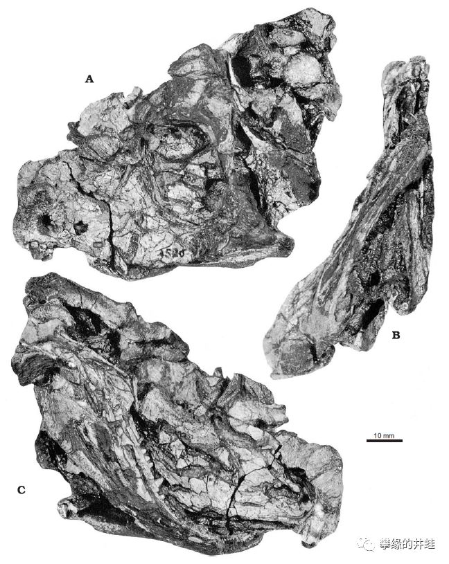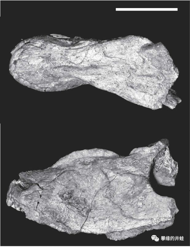 卡鲁盆地发现的巴莫鳄类Leucocephalus wewersi化石。图片来源自[9],标尺长度2厘米。