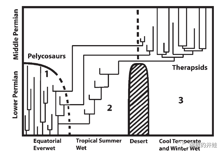 盘龙目和兽孔目的生存年代和分布范围示意图。显然,兽孔目比它的前辈更加适应干旱和寒冷的气候。由于缺乏软体组织的话说资料,我们并不能确定兽孔目究竟获得了怎样的装备,也许它们的羊膜卵结构更复杂,更加保温保水;也许是皮肤更加坚韧,甚至有毛发覆盖;也许代谢水平更高可以产生更多热量,甚至在某种程度上可以保持体温恒定。图片来源自[3]。