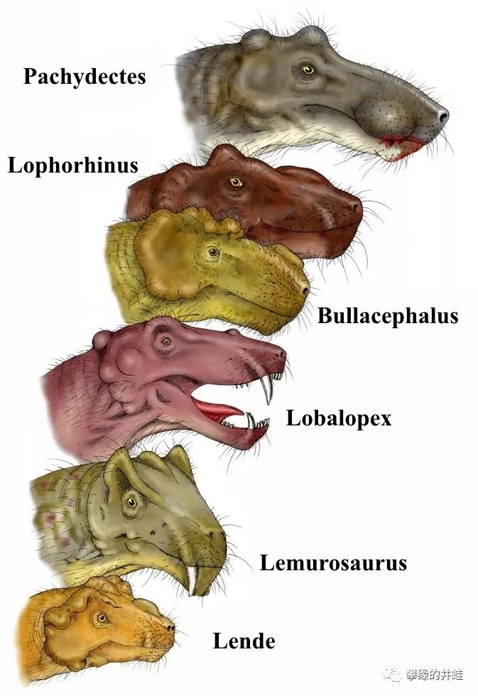 一些伯纳特兽类的头部复原图。它们的脑袋变得疙疙瘩瘩的。看不出这些结构对狩猎或者争斗有什么帮助,很可能是用来向异性展示魅力的第二性征。图片来源自网络。