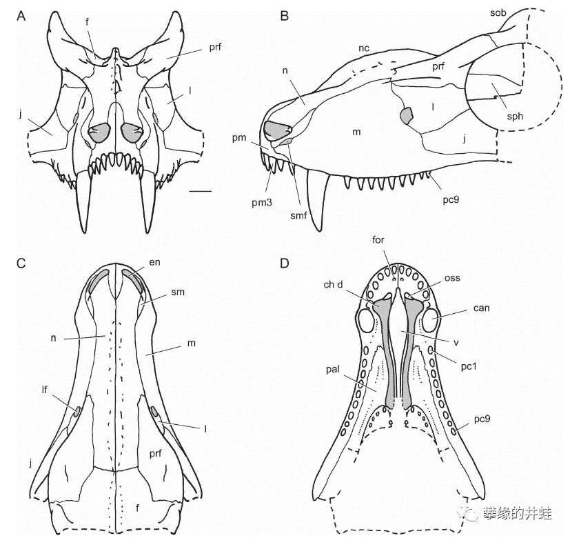 南非的卡鲁盆地(Karoo Basin)和附近地区发现了许多演化后期的巴莫鳄类化石,但是基本上都只留下了头骨(当然很可能是井蛙没有找到,如果有大神有这些巴莫鳄的骨架照片,可否分享一下,不胜感谢),比如这些: