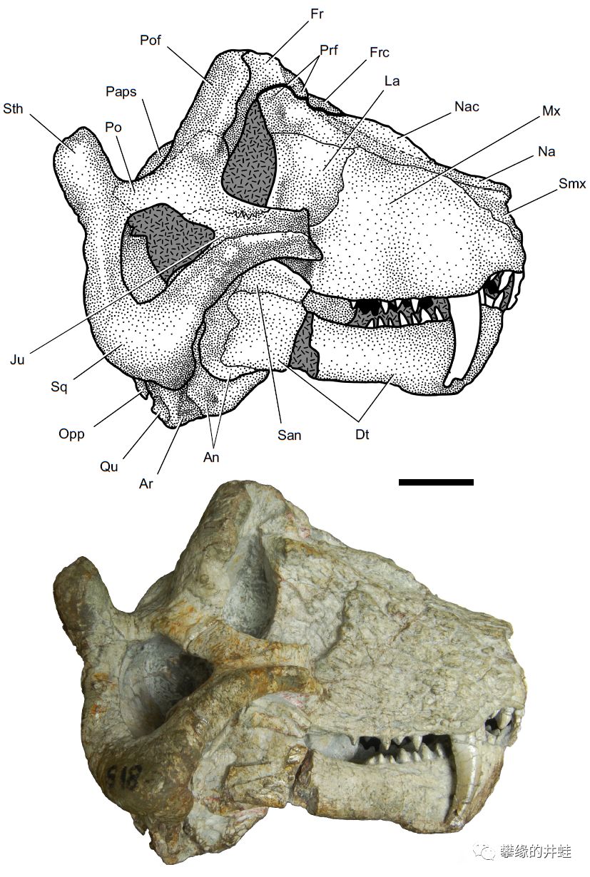 卡鲁盆地发现的另一种伯纳特兽类:Lophorhinus willodenensis。它的眉弓特别突出,鼻骨正中还有一道隆起的中脊。图片来源自[13],标尺长度4厘米。