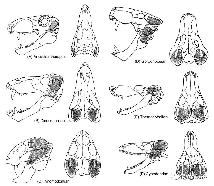 兽孔目主要类群的咬合肌结构复原图。A:巴莫鳄亚目;B:恐头兽亚目;C:异齿兽亚目;D:丽齿兽亚目;E:兽头亚目;F:犬齿兽亚目。图片来源自[3]。