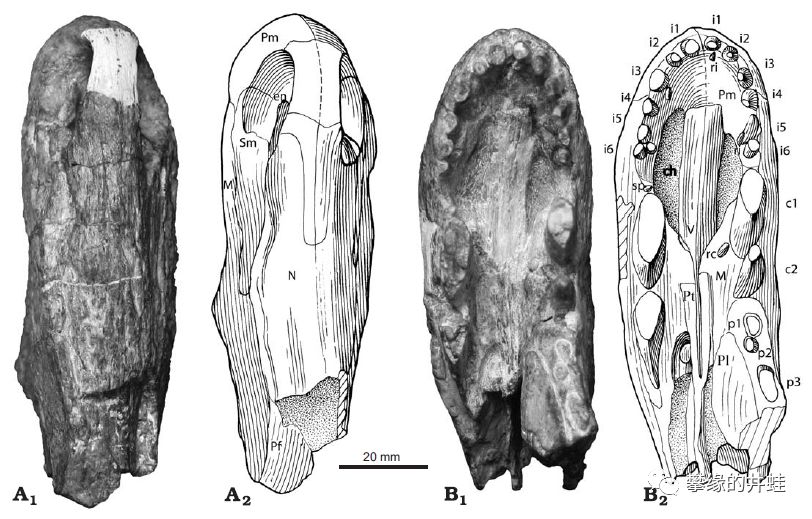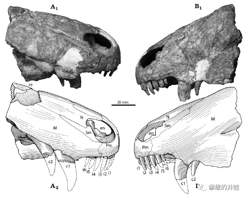 大山口珍稀兽化石。尽管化石资料如此缺少,但看到那两对特别显眼的“虎牙”,就可以确定它属于兽孔目。图片来源自[5]。