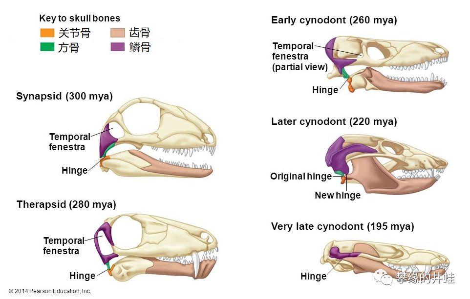 合弓纲下颌演化过程简图。可以看到兽孔目的演化阶段,齿骨不断强化,挤掉了其他下颌骨骼。图片来源见水印,有改动。