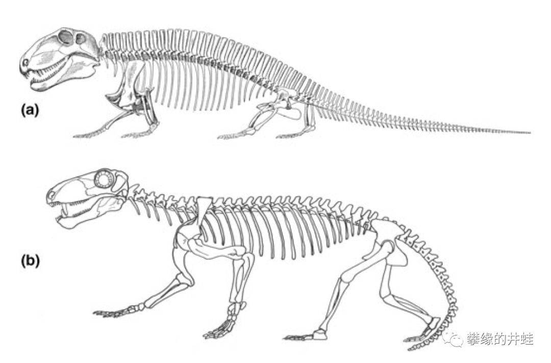 楔齿龙(a)和巴莫鳄(b)骨骼复原图。巴莫鳄的头骨结构仍然和楔齿龙近似,颞颥孔,异型齿和下颌齿骨都有进一步的演化。肢骨更长而粗壮,可以把身体抬离地面。看看两者的对比,就不难理解为什么盘龙目会退出历史舞台了。遗憾的是,由于早期化石资料的缺失,我们还无从知道兽孔目是怎样从“蜥蜴爬”过渡到“直立跑”。图片来源自[2]。