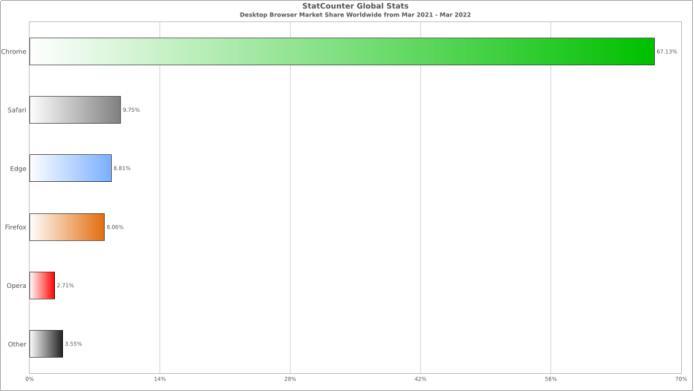 据国际统计网站 Statcounter 的数据显示,截至今年 3 月底,浏览器市场份额前三名分别是谷歌浏览器(67.13%)、Safari 浏览器(9.75%)、Edge 浏览器(8.81%),而 IE 浏览器的占比不到 2%。
