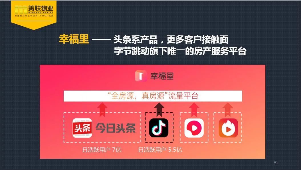 贾铭: 幸福里的未来,可能需要更强力度的自主创新,而不来自一味的行业跟随与模仿。 字节有抖音这样的革命性产品,房产领域是不是应该有视频信息整合更为得当的信息交流模式? 社区大妈和小区保安、房产租客能不能服务于房产交易的价值链(并分享其中的收益)?这些方向上,需要字节系、需要幸福里更大的释放创造力。