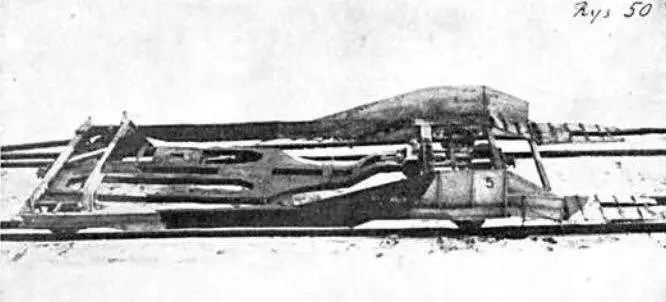 在这里,作者介绍一下TK和TKS两种铁道装甲车如何上下自己的铁道底盘。这种铁道底盘有一个支撑坦克底部的中央横梁,其后端与坦克车体铰接,由链轮和链条调整高度,依靠液压装置驱动。铁道底盘前端有两块斜板,对应TKS坦克的两条履带,由扁平弹簧支撑在铁道底盘上面,能够向上折叠,专供坦克上下铁道底盘,而斜板侧面有两个挡板负责稳定坦克的行动轨迹。在铁道上行驶时,中央横梁会稍微抬起,承担坦克的部分重量。当铁道底盘由其他列车牵引时,车组人员可以操作液压器让中央横梁完全升起,TKS坦克则搁置在上面。