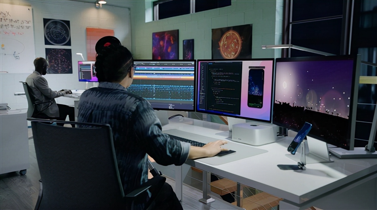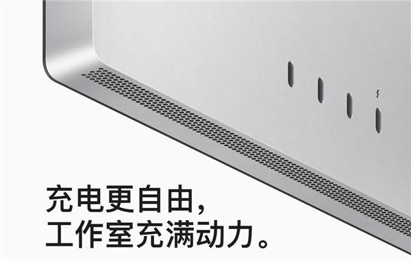 接口方面,Studio Display拥有三个USB-C端口,方便连接网络以及外置硬盘、键盘、鼠标和iPhone等设备,还能为这些外设供电或充电。