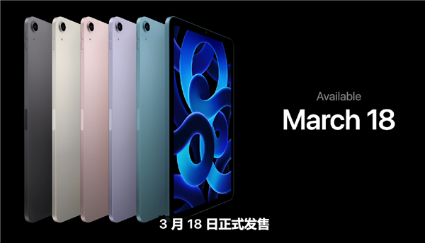 新款iPad Air售价4399元起,提供64/256GB两个版本,并有Wi-Fi和5G两种版本,将于3月18日正式发售。