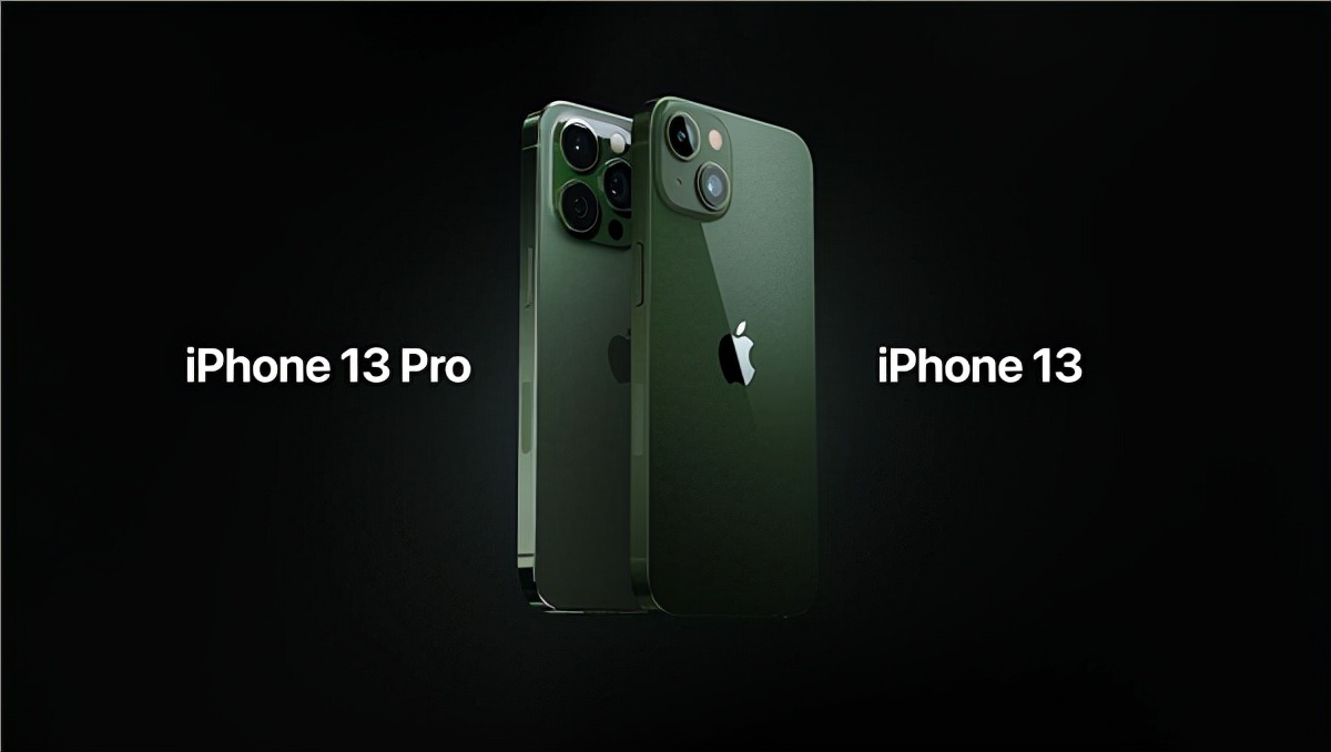 库克宣布了iPhone 13系列的新配色,两种绿色。其中,iPhone 13 mini、iPhone 13上简单直接地叫“绿色”(Green),iPhone 13 Pro、iPhone 13 Pro Max上则是“苍岭绿”(Alpine Green),色调更浅一些。
