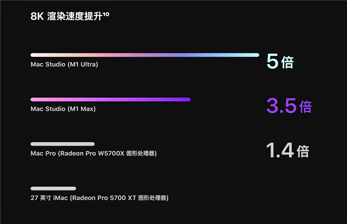 CPU性能方面,M1 Ultra 比 10 核 i9 iMac 快 3.8 倍,比配备 16 核 Xeon 的 Mac Pro 快 90%。
