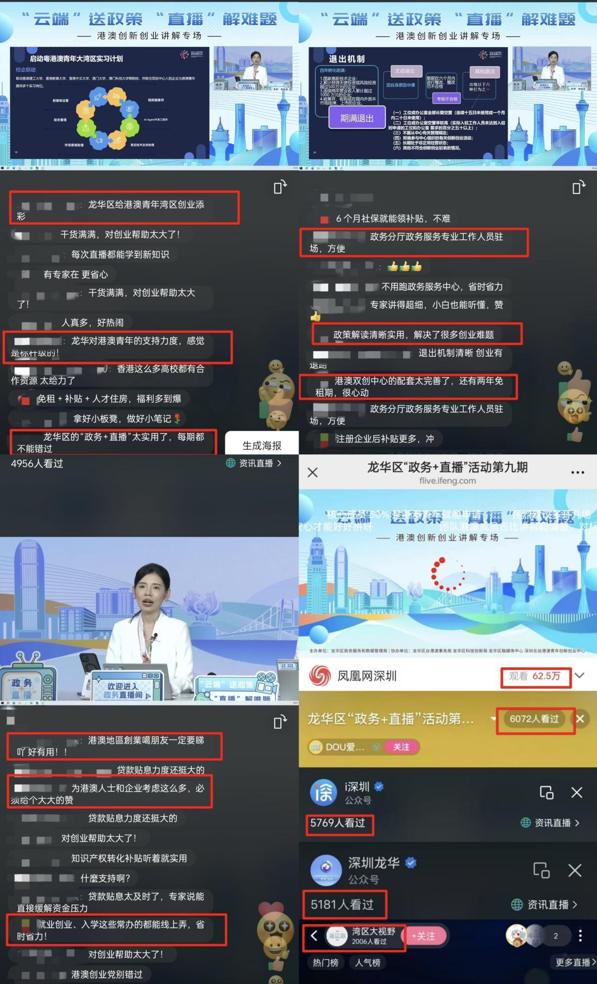为精准服务港澳青年北上创新创业需求,近日,由龙华区政务服务和数据管理局主办,龙华区台港澳事务局、龙华区科技创新局、龙华区融媒体中心、深圳北站港澳青年创新创业中心协办的龙华区“政务+直播”活动第九期——“港澳创新创业讲解专场”在“i深圳”“深圳龙华”视频号、“DOU爱龙华”抖音号、“凤凰新闻”APP等平台顺利开播,共吸引64.43万人次在线实时观看,收获点赞58.35万次、有效评论8,415条,获得“政策解读清晰实用,解决了很多创业难题”“港澳双创中心的配套太完善了,还有两年免租期,很心动”“为港澳人士和企业考虑这么多,必须给个大大的赞”等积极评价。