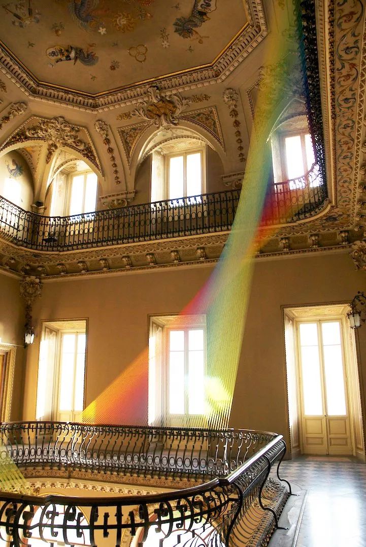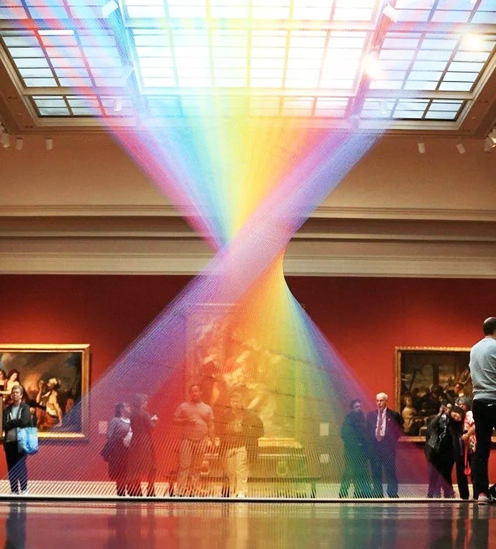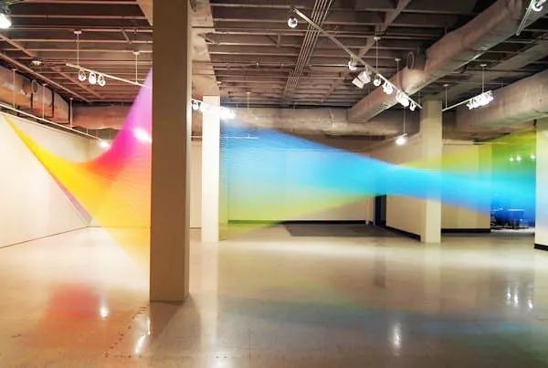 雨过天晴后的彩虹,是一场很美却短暂的邂逅。但艺术家加布里埃尔·达维(Gabriel Dawe)却立志要将触摸得到、可永久保存的彩虹留给世界。他将家乡墨西哥昌盛的纺织业与建筑结合起来,用不同的棉线编织出一道又一道壮观而闪耀的彩虹。