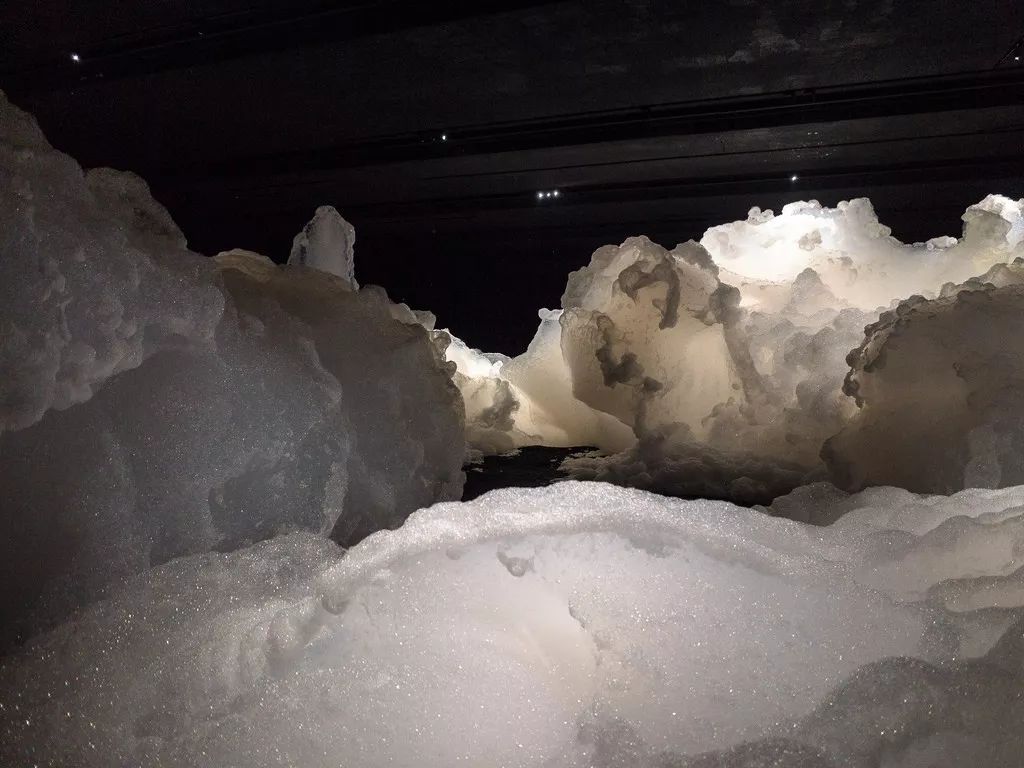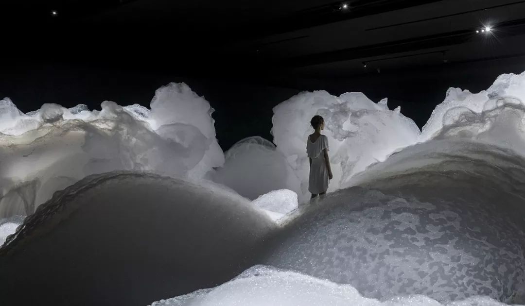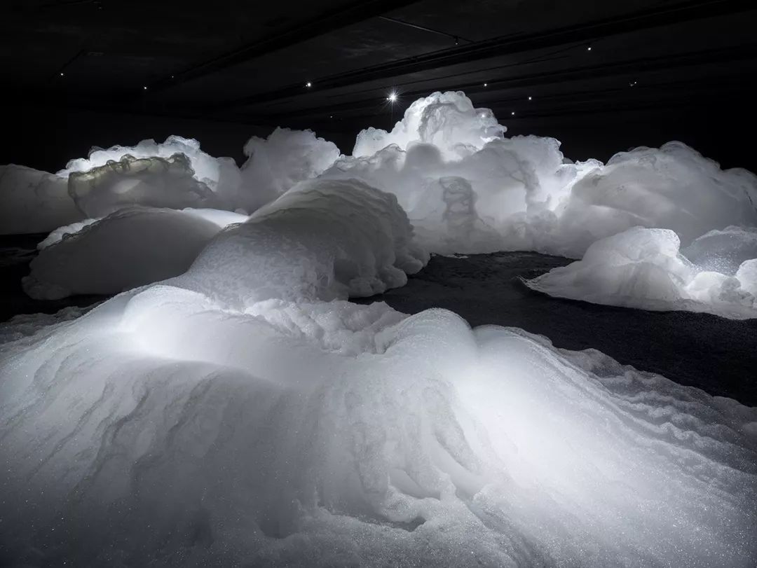 在作品《泡沫》(Foam)中,日本艺术家明和晃平(Kohei Nawa)运用洗涤剂、甘油和水混合出的泡沫布置在一个铺满小石子的黑暗房间里,观看者可以自由行走。白色的液体泡沫象征着不断生成、破灭,再不断生成的细胞从增殖到死亡的新陈代谢。