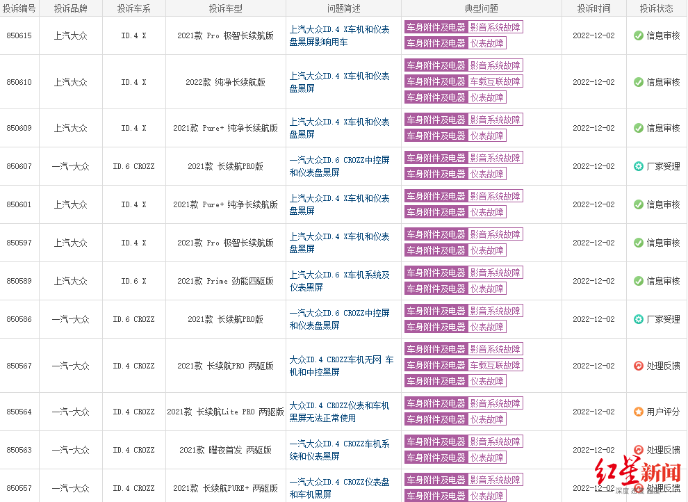 红星资本局注意到,在汽车质量投诉平台车质网上,针对大众ID系列电动车车机问题的投诉在4天内激增超120条。一些车主指出,大小屏双黑后不仅看不见屏幕上的各种信号,很多辅助功能也无法使用,严重影响行车安全。4S店与厂家承认问题,但至今未解决。