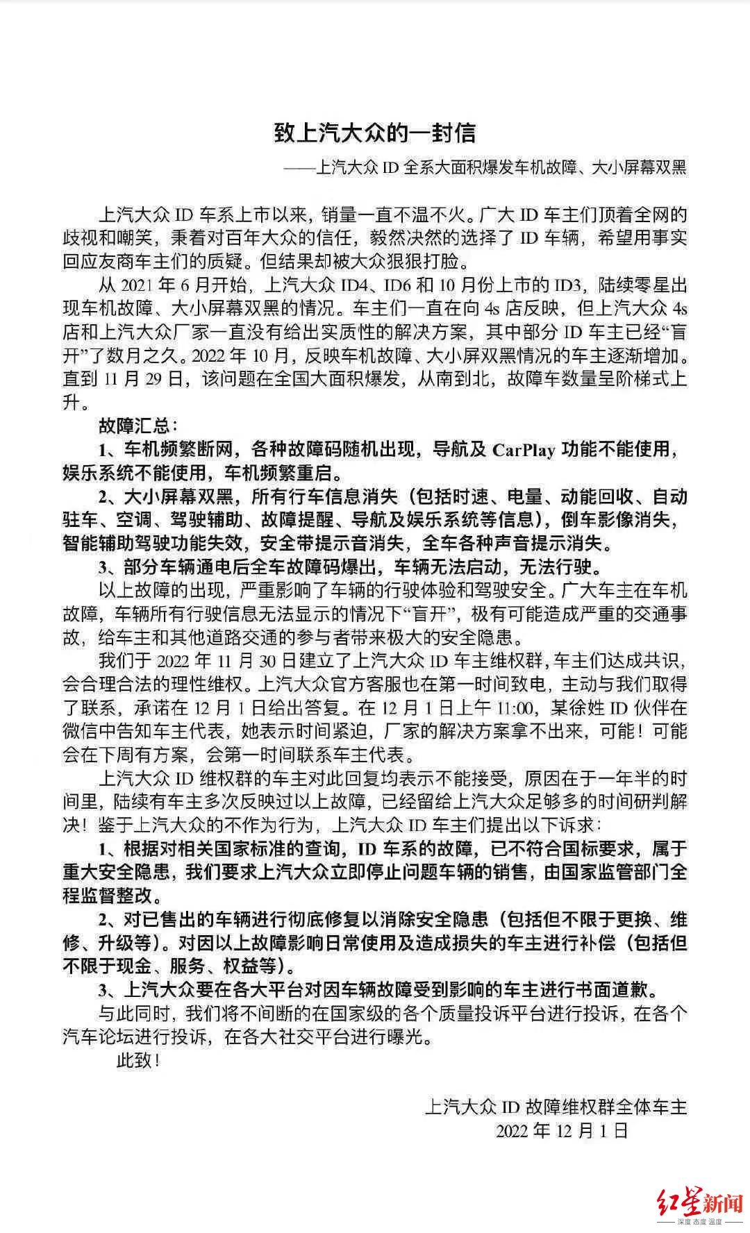 12月1日,上汽大众ID故障维权车主们发布了《致上汽大众的一封信》。信中写道,从2021年6月开始,大众ID4、ID6和ID3陆续零星出现车机故障、大小屏幕全黑的情况。车主们一直在向4S店反映,但4S店与上汽大众厂家一直没有给出实质性的解决方案,其中部分车主已经“盲开”了数月之久。今年10月,反映车机故障、大小屏双黑情况的车主逐渐增加,直到11月29日,故障车数量呈阶梯式上升。
