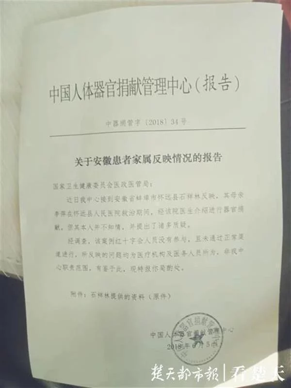 担心怀远县红十字会工作人员搞错情况,石祥林又找到蚌埠市红十字会了解当年该市居民器官捐献的情况。市红十字会办公室一位主任告诉石祥林,该市2018年没有捐献器官的情况,如果有,他们会得到通知的。