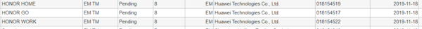 【手机中国新闻】目前智能手机厂商进军其他领域的现象愈发普遍,不少手机厂商都推出了相应的品牌,在多个方面满足消费者的使用需求。近日,有海外网友发现了三个华为的全新商标,它们分别是“Honor Home”、“Honor Go”以及“Honor Work”,似乎对应着不同的领域。