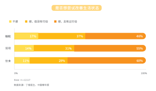 而在睡眠方面,34%的男生和47%的女生都有过睡眠困扰,尤其是大四之后,越来越多的大学生选择主动晚睡,硕博士中有一半人睡眠不足。有79%的大学生上床后不会立刻睡觉。同时调查发现,60%的大学生会主动采取行动改善自身健康状况,但相比饮食和运动,尝试过改善睡眠的大学生比例最低。