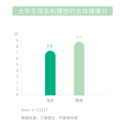 虽然88%的大学生健康自评分数已经超过及格线,但大学生们普遍对健康抱有更高的期待,理想值高达8.9分,面对学业、生活和就业的压力,其健康现状与理想还存在一定差距。