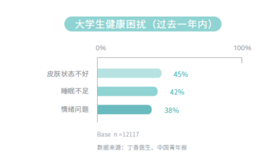 《报告》显示,86%的大学生表示,在过去一年中出现过健康困扰。其中,排名前三的分别是皮肤状态不好、睡眠不足和情绪问题。