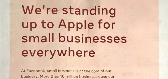 Facebook 称苹果隐私政策的改变,将摧毁那些依赖于广告平台产生销售额的小企业。在刊登于报纸的广告中。
