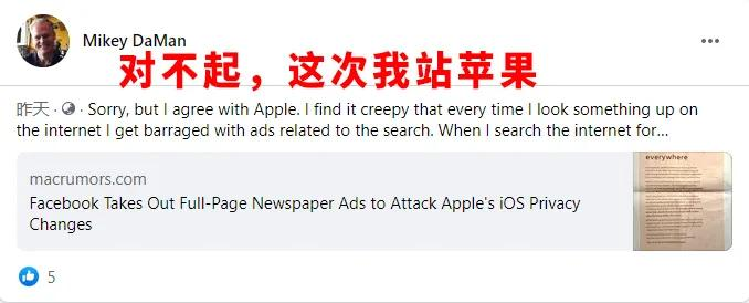 早在苹果提出这项隐私政策时,Facebook 就举起了反对的旗帜。