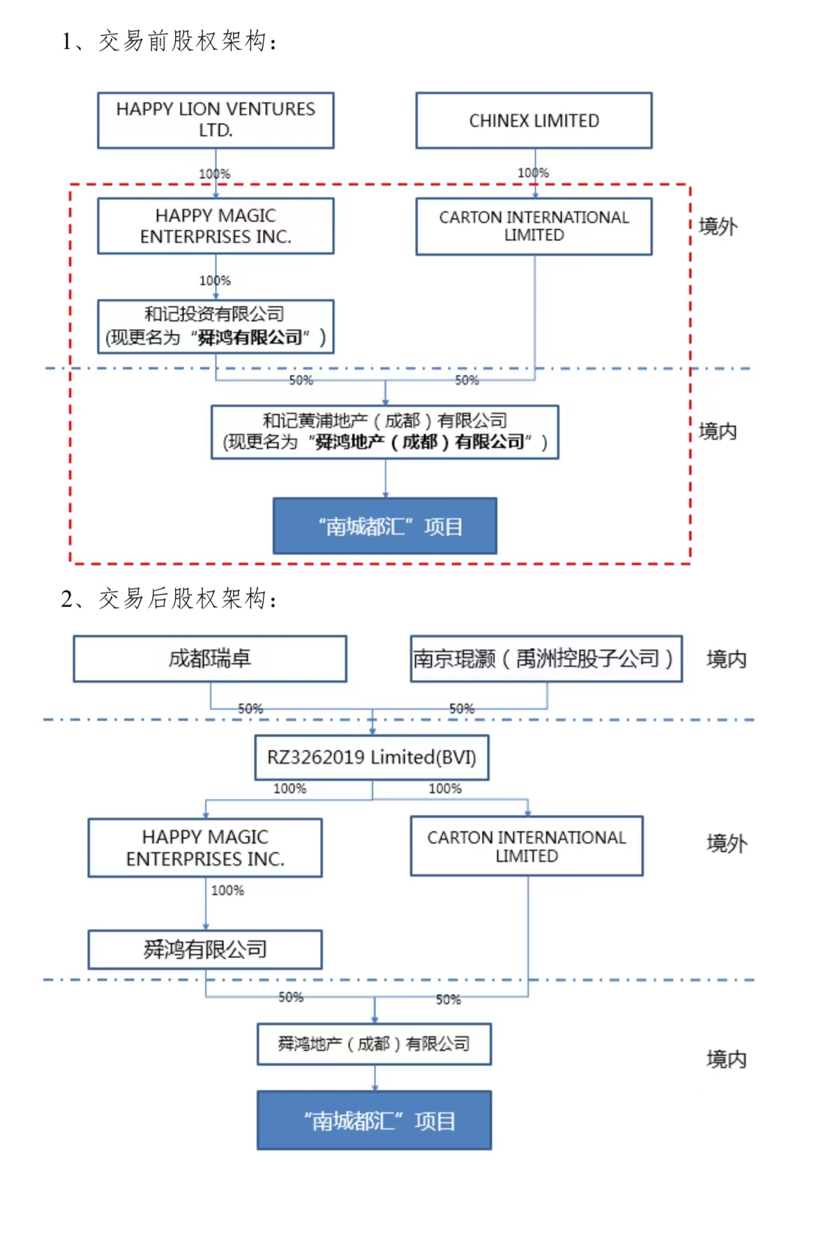到2020年,李嘉诚方突然开始了撤退。根据当时长江实业公告,当年7月,南城都汇被转手给注册在维京群岛的RZ3262019 Limited(简称“RZ”),后者由禹洲集团和成都瑞卓置业有限公司(以下简称瑞卓)各持股50%。