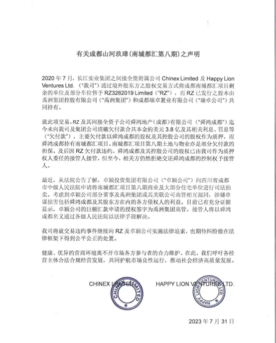 彼时,长江实业集团的全资附属公司Chinex Limited及Happy Lion Ventures Ltd联合发表声明,指出RZ及其全资子公司舜鸿成都欠他们及集团公司约3.8亿美元本金及相关利息等未还。而该欠款以舜鸿成都及其控股公司的股权作为质押,而舜鸿成都正是南城都汇项目的持有者。由于RZ违约,舜鸿成都及其控股公司的股权已被他们委任的接管人接管。