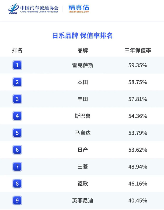 雷克萨斯三年保值率59.35%,位居日系品牌榜首。虽说相比前些年巅峰时刻略有差距,可在新能源浪潮冲击下能有此成绩实属不易。一方面,其燃油车质量可靠、舒适性佳的口碑仍在,“开不坏的雷克萨斯” 可不是白叫的;另一方面,积极布局新能源,混动车型技术成熟,逐渐站稳脚跟。
