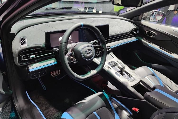 设计层面上,该车外观样式和品牌现役车型均有较大差异,大嘴前格栅和三角LED头灯设计,均让人印象深刻;同时,下压式的机舱盖、隆起的轮眉以及溜背式尾部造型,都高度契合其四门轿跑的定位;而在硬货部分,19英寸五幅式轮圈、双边四出排气、无框车门、掀背式尾门对这台车已经是基本操作,该车还配备了三段式的可升降电动尾翼,有那么点保时捷Panamera的味道。